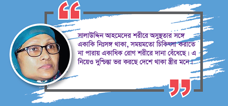 সালাউদ্দিনের স্ত্রী সাবেক সংসদ সদস্য হাসিনা আহমেদ বলেন, ‘উনার (সালাউদ্দিন) শারীরিক অবস্থা আগের মতোই খারাপ। কোথাও গিয়ে ডাক্তার দেখাবেন সেই অবস্থাটুকুও এখন নেই। আর একা একা কোনো মানুষ যদি কোথাও পড়ে থাকে সে-কি সুস্থ থাকতে পারে? শিলংয়ে তার একাকি নিঃসঙ্গ দিন কাটছে।’