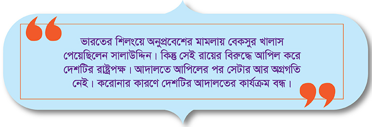 পরিবারের সঙ্গে কথা বলে জানা গেছে, ভারতের শিলংয়ে অনুপ্রবেশের মামলায় বেকসুর খালাস পেয়েছিলেন সালাউদ্দিন। কিন্তু সেই রায়ের বিরুদ্ধে আপিল করে দেশটির রাষ্ট্রপক্ষ। আদালতে আপিলের পর সেটার আর অগ্রগতি নেই। করোনার কারণে দেশটির আদালতের কার্যক্রম বন্ধ। ঢাকাটাইমসের সঙ্গে আলাপকালে সালাউদ্দিনের স্ত্রী হাসিনা আহমেদ বলেন, তার শারীরিক অবস্থা আগের তুলনায় আরো খারাপ হয়েছে। কিডনি, হার্টে সমস্যা ও ডায়াবেটিকসহ বিভিন্ন রোগে ভুগছেন তিনি। শিলংয়ে অবস্থানকালে তিনি কিডনি ও মূত্রথলিতে অপারেশন করিয়েছেন।