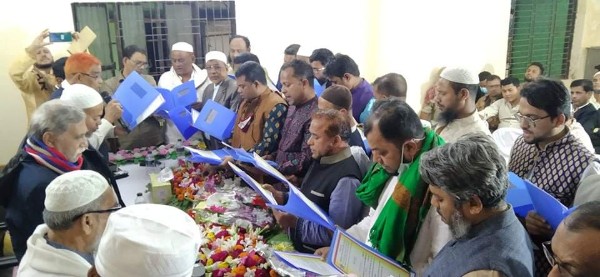 পরে নব নির্বাচিত কার্যকরী পরিষদকে ফুল দিয়ে বরণ করে নেওয়া হয়। এরপর নবনির্বাচিতদের শপথ বাক্য পাঠ করান নির্বাচন পরিচালনা বোর্ডের চেয়ারম্যান এস্তাফিজুর রহমান।