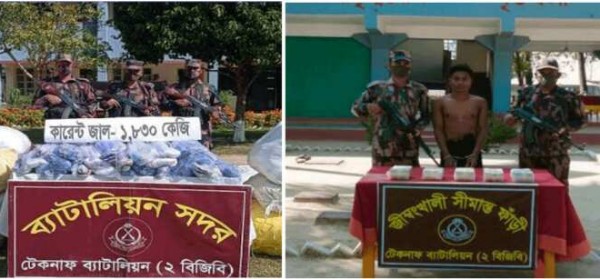 অপরদিকে, ২কোটি ১৬ লক্ষ টাকা মূল্যের ২৭০০ কেজি অবৈধ কারেন্ট জাল জব্দ করা হয়েছে। ব্যাটালিয়নের নিজস্ব গোয়েন্দা তথ্যের ভিত্তিতে জানা যায় যে, টেকনাফ ব্যাটালিয়ন (২ বিজিবি) এর অধীনস্থ শীলখালী অস্থায়ী চেকপোষ্ট হতে আনুমানিক ৪ কিঃ মিঃ উত্তরে শ্যামলাপুর বাজারে একটি গুদামে অবৈধ চোরাচালানী মালামাল বিক্রয়ের উদ্দেশ্যে লুকায়িত রয়েছে। উক্ত সংবাদের ভিত্তিতে টেকনাফ ব্যাটালিয়ন সদর হতে ভারপ্রাপ্ত অপারেশন অফিসারের নেতৃত্বে একটি বিশেষ টহলদল দ্রুত বর্ণিত স্থানে গমণ করে স্থানীয় জনপ্রতিনিধি এবং গন্যমাণ্য ব্যক্তিবর্গের উপস্থিতিতে উক্ত গুদাম ঘরে তল্লাশী অভিযান পরিচালনা করা হয়। তল্লাশীর এক পর্যায়ে গুদাম ঘরের মধ্য হতে ২ কোটি ১৬ লক্ষ টাকা মূল্যের ২ হাজার ৭শত কেজি অবৈধ কারেন্ট জাল জব্দ করা হয়।