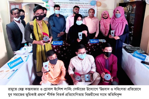 রামুতে হেল্প কক্সবাজার ও গ্লোবাল ইংলিশ লার্নিং সেন্টারের যৌথ উদ্যোগে “উগ্রবাদ ও সহিংসতা প্রতিরোধে যুব সমাজের ভুমিকাই প্রধান” শীর্ষক বিতর্ক প্রতিযোগিতা অনুষ্ঠিত হয়েছে। ইপসা সিভিক কনসোর্টিয়াম এর সার্বিক সহযোগিতা শুক্রবার (২৫ ফেব্রæয়ারি) বিকাল ৩টায় রামু চৌমুহনী সংলগ্ন গেøাবাল ইংলিশ লার্নিং সেন্টার মিলনায়তনে এ প্রতিযোগিতার আয়োজন করা হয়।