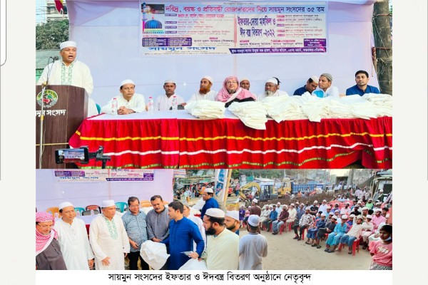 স্বেচ্ছাসেবী সামাজিক সংগঠন সায়মুন সংসদ দরিদ্র, এতিম, বয়স্ক ও প্রতিবন্ধী রোজাদারদের নিয়ে ৩৫ তম ইফতার ও প্রায় ৩শ জনকে নিয়ে ঈদবস্ত্র বিতরণ অনুষ্ঠান সম্পন্ন হয়। এ অনুষ্ঠান গতকাল (১৯ রমজান) ২১ এপ্রিল ২০২২ কক্সবাজার পৌরসভার ০৫নং ওয়ার্ডের আলীর জাঁহালস্থ সায়মুন সংসদের নিজস্ব উন্মুক্ত মঞ্চে সংগঠনের সভাপতি ও কক্সবাজার সিটি কলেজের সমাজবিজ্ঞান বিভাগের শিক্ষক নুরুল আবছার (সিকদার)’র সভাপতিত্বে ও ইমরুল সাহেদের সঞ্চালনায় অনুষ্ঠিত হয়। অনুষ্ঠিত ইফতার, দোয়া মাহফিল ও ঈদবস্ত্র বিতরণ অনুষ্ঠানে প্রধান অতিথি ছিলেন, কক্সবাজার উন্নয়ন কর্তৃপক্ষের চেয়ারম্যান লে. কর্ণেল (অব:) ফোরকান আহমদ এলডি,এমসি,পিএসসি।