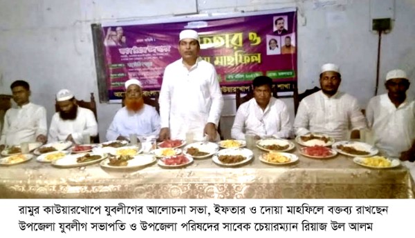 রামু উপজেলার কাউয়ারখোপ ইউনিয়ন যুবলীগের উদ্যোগে আলোচনা সভা, ইফতার ও দোয়া মাহফিল অনুষ্ঠিত হয়েছে। মঙ্গলবার (২৬ এপ্রিল) বিকালে কাউয়ারখোপ হাকিম রকিমা উচ্চ বিদ্যালয় মাঠে এ ইফতার মাহফিল অনুষ্ঠিত হয়।