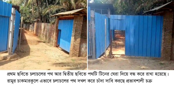 রামুর চাকমারকুলে স্থাপনা নির্মাণে বাঁধা প্রদান ও চলাচলের পথ বন্ধ করে চাঁদা দাবি করার অভিযোগ পাওয়া গেছে। চাঁদা না দেয়ায় হামলার শিকার হয়েছেন জমির মালিক আবু তাহের ও তার পরিবারের সদস্যরা। এ ঘটনায় রামু থানায় লিখিত এজাহার দিয়েছেন- রামুর চাকমারকুল ইউনিয়নের পশ্চিম চাকমারকুল গ্রামের মৃত মো. হোছনের ছেলে আবু তাহের।