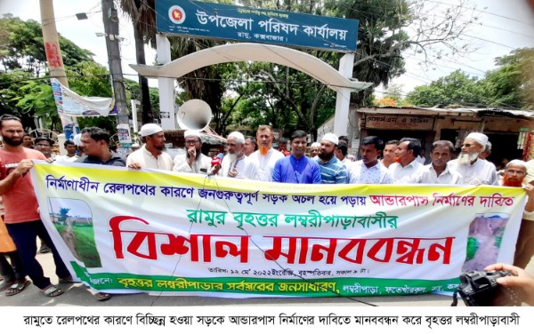 কক্সবাজারের রামুতে নির্মাণাধীন রেলওয়ে সড়কের কারণে রামু লম্বরীপাড়া থেকে সিপাহীর পাড়া হয়ে চৌমুহনীর সাথে সংযুক্ত আলহাজ্ব সাইমুম সরওয়ার কমল সড়ক অচল হয়ে পড়ায় আন্ডারপাস নির্মাণের দাবিতে বিশাল মানববন্ধন করেছে বৃহত্তর রামু লম্বরীপাড়াবাসী। বৃহস্পতিবার  (১২মে) বেলা ১১ টায় রামু উপজেলা গেইটে অনুষ্ঠিত এ মানববন্ধনে শতশত মানুষ প্রচন্ড রোদ উপেক্ষা করে স্বতঃস্ফূর্তভাবে অংশ নেন। এর পূর্বে সকাল ১০ টায় বৃহত্তর লম্বরীপাড়ার ভুক্তভোগী সর্বস্তরের জনসাধারণ নির্মাণাধীন রেলওয়ে সড়কে সমবেত হয়ে বিক্ষোভ প্রদর্শন করেন। পরে প্রচন্ড রোদের মধ্যে অচল হয়ে পড়া সড়ক দিয়েই এলাকাবাসী পায়ে হেঁটে রামু উপজেলা পরিষদ গেইটে এসে মানববন্ধনে শরীক হন।