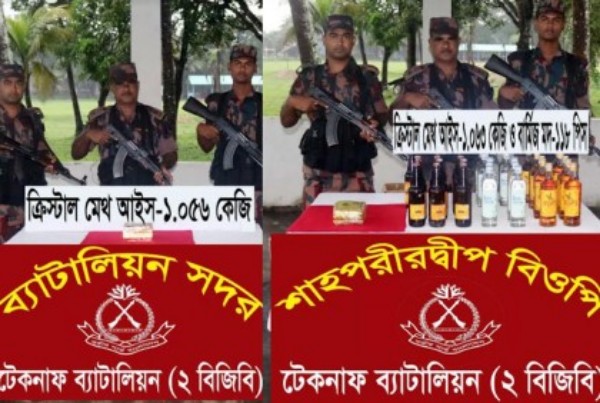 পরে টহলদল ওই কেওড়া বাগানের সম্ভাব্য স্থানে ব্যাপক তল্লাশী অভিযান পরিচালনাকালে চোরাকারবারী কর্তৃক কৌশলগতভাবে গাছের ঝোপে লুকানো অবস্থায় কয়েকটি স্থানে কালো পলিথিনের প্যাকেট দেখতে পায়। এর মধ্যে একটিতে মোড়ানো ৫ কোটি ২৮ লাখ টাকার ১ কেজি ৫৬ গ্রাম ক্রিস্টাল মেথ আইস জব্দ করতে সক্ষম হয় ।তিনি জানান, একইদিন ভোরে অপর একটি অভিযানে শাহপরীরদ্বীপ বিওপি’র বিআরএম-৪ হতে আনুমানিক ১ কিলোমিটার দক্ষিণ দিকে ওবিএম পোষ্টের সামনে নাফ নদীর কিনারা দিয়ে মাদকদ্রব্যের একটি বড় চালান মিয়ানমার হতে বাংলাদেশে পাচারের সংবাদে শাহপরীরদ্বীপ বিওপি’র একটি চোরাচালান প্রতিরোধ টহলদল বেড়ী বাঁধের আঁড় নিয়ে কৌশলগত অবস্থান গ্রহণ করে। আনুমানিক তিনটার দিকে টহলদল উক্ত স্থান হতে আনুমানিক ৩০০ গজ পূর্ব দিকে ২-৩ জন ব্যক্তিকে কয়েকটি বস্তা মাথায় করে নাফনদী হতে বেড়ী বাঁধের উপরে উঠতে দেখে।