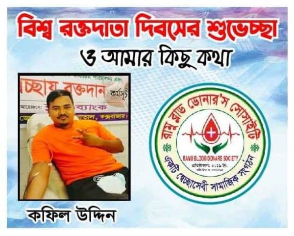 কক্সবাজারের রামু উপজেলার সর্বপ্রথম গণপ্রজাতন্ত্রী বাংলাদেশ সরকার কতৃক নিবন্ধনপ্রাপ্ত স্বেচ্ছাসেবী সামাজিক সংগঠন রামু ব্লাড ডোনার’স সোসাইটি এক ঝাঁক কলেজ বিশ্ববিদ্যালয় পড়ুয়া তরুন ও যুবকদের নিয়ে ২০১৯ সাল থেকে ৯৭ জন স্বেচ্ছাসেবক স্বেচ্ছাসেবী ও সামাজিক কাজ করে যাচ্ছে প্রতিনিয়ত। তাদের কে জানাই আমার অন্তরের অন্তরস্থল থেকে হৃদয় নিড়ানো স্যালুট ও রক্তদাতা দিবসের শুভেচ্ছা। আগামি দিনগুলো রক্তদান ও সামাজিক কাজ দিয়ে মানুষের পাশে থাকবেন সেই কামনা করি।
