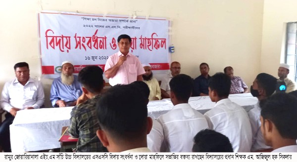 কক্সবাজারের রামুর প্রাচীনতম শিক্ষা প্রতিষ্ঠান জোয়ারিয়ানালা এইচ.এম সাঁচি উচ্চ বিদ্যালয়ের এসএসসি পরীক্ষার্থী’২২ এর বিদায় সংবর্ধনা ও দোয়া মাহফিল অনুষ্ঠিত হয়েছে। বৃহষ্পতিবার (১৬ জুন) সকাল ১১টায় বিদ্যালয় মিলনায়তনে অনুষ্ঠিত সভায় বিদ্যালয়ের প্রধান শিক্ষক এম আজিজুল হক সিকদার সভাপতিত্ব করেন। বিদায় সংবর্ধনা ও দোয়া মাহফিলে প্রধান অতিথির বক্তব্য রাখেন, রামু প্রেস ক্লাবের সভাপতি, বিদ্যালয় পরিচালনা কমিটির শিক্ষানুরাগী সদস্য ও সাবেক সভাপতি নীতিশ বড়–য়া। বিশেষ অতিথি ছিলেন পরিচালনা কমিটির অভিভাবক সদস্য নুরুল হক মেম্বার।
