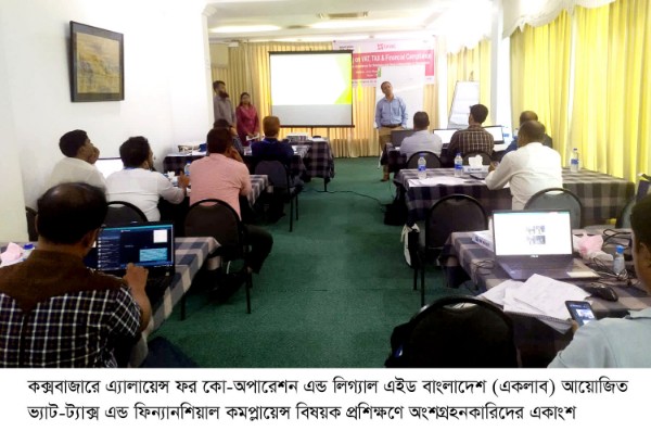 এ্যালায়েন্স ফর কো-অপারেশন এন্ড লিগ্যাল এইড বাংলাদেশ (একলাব) এর আয়োজনে ভ্যাট-ট্যাক্স এন্ড ফিন্যানশিয়াল কমপ্লায়েন্স বিষয়ক দুইদিন ব্যাপী প্রশিক্ষণ বুধবার, ২৯ জুন শুরু হয়েছে। কক্সবাজারের ইউনি রিসোর্ট এর হলরুমে ব্র্যাক, শেড, নোঙ্গর, পালস কক্সবাজার ও একলাবের অংশগ্রহণে প্রশিক্ষণটি শুরু হয়। প্রশিক্ষণটি পরিচালনা করেন এসপি চৌধুরী এন্ড কোং এর চন্দ্র শেখর পাল চৌধুরী (এফসিএ) ও  তাঁর  দুজন সহকারী কাজী সোনিয়া নাজনীন ও মো: গোলাম মোস্তফা। প্রশিক্ষণের শুরুতে স্বাগত বক্তব্য রাখেন একলাব এর প্রজেক্ট ম্যানেজার নূরে আলম মিলন ও প্রোগ্রাম ডিরেক্টর মো আবু বকর সিদ্দিক। প্রশিক্ষণের শুরুতে একলাবে কর্মরত প্রয়াত মরহুম খাইরুল ইসলাম এর স্মরণে এক মিনিট নীরবতা পালন করে ওনার রুহের মাগফেরাত কামনা করে শোক সন্তপ্ত পরিবারের প্রতি সমবেদনা জ্ঞাপন করা হয়।