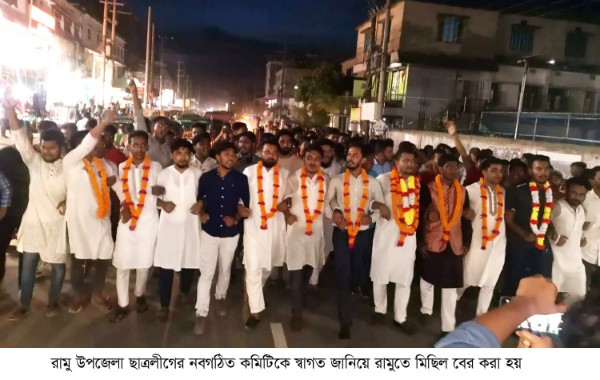 এদিকে রামু উপজেলা ছাত্রলীগের নবগঠিত আহবায়ক কমিটির ঘোষনার প্রেক্ষিতে রবিবার সন্ধ্যায় রামুতে স্বাগত মিছিল ও সংক্ষিপ্ত সমাবেশ অনুষ্ঠিত হয়। মিছিল গুরুত্বপূর্ণ সড়ক প্রদক্ষিণ শেষে চৌমুহনী স্টেশনে আয়োজিত সংক্ষিপ্ত সমাবেশে বক্তব্য রাখেন- রামু উপজেলা স্বেচ্ছাসেবকলীগের সাধারণ সম্পাদক তপন মল্লিক, রামু উপজেলা ছাত্রলীগের সাবেক যুগ্ন আহবায়ক রাশেদ আলী খান, সাবেক ছাত্রলীগ নেতা সোহরাব কামাল জাবেদ ও রামু উপজেলা ছাত্রলীগের নবগঠিত কমিটির আহবায়ক তসলিম ইকবাল সোহেল। এসময় রামু উপজেলা ছাত্রলীগের নবগঠিত কমিটির সকল নেতৃবৃন্দ ও ছাত্রলীগের বিপুল নেতাকর্মী উপস্থিত ছিলেন।