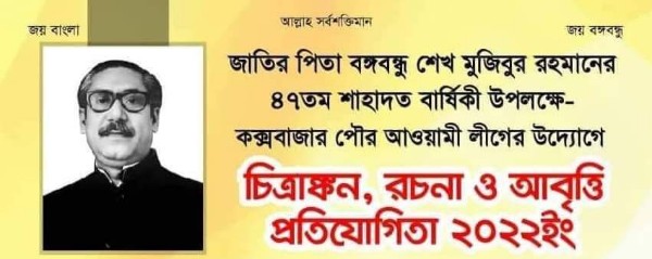 জাতির পিতা বঙ্গবন্ধু শেখ মুজিবুর রহমানের ৪৭তম শাহাদত বার্ষিকী উপলক্ষে কক্সবাজার পৌর আওয়ামী লীগের উদ্যোগে আয়োজিত তিন দিনের প্রতিযোগিতা আগস্ট আগস্ট শুরু হবে। যা ২৭ আগস্ট শেষ হবে। চিত্রাঙ্কন, রচনা ও আবৃত্তি নিয়ে এ তিনটি প্রতিযোগিতা সম্পন্ন করতে সকল প্রস্তুতি শেষ হয়েছে।