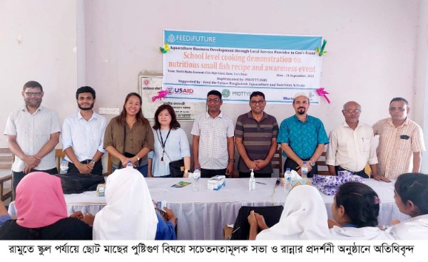 রামুতে পুষ্টিকর ছোট মাছের রেসিপি এবং সচেতনতামূলক ইভেন্টের উপর স্কুল পর্যায়ের রান্নার প্রদর্শনী অনুষ্ঠিত হয়ছে। বুধবার, ২১ সেপ্টেম্বর সকালে রামুর জোয়ারিয়ানালা শেখ হাসিনা বালিকা উচ্চ বিদ্যালয়ে এ প্রদর্শনী অনুষ্ঠিত হয়। বেসরকারি সংস্থা প্রত্যাশীর আয়োজনে এবং ওয়ার্ল্ড ফিশ এর উদ্যোগে এ অনুষ্ঠানে সম্মানিত অতিথি হিসেবে উপস্থিত ছিলেন- মালয়েশিয়া ওয়ার্ল্ড ফিশ এর বাজেটিং ম্যানেজার সেভি কেক, ওয়ার্ল্ড ফিশ ঢাকাস্থ ফাইন্যান্স এন্ড গ্রান্ড ম্যানেজার স্যালি ম্যালাইরী, সিনিয়র প্রোগ্রাম ম্যানেজার মো. এমদাদ হোসেন, জোন ওব রেজিলেন্স কো-অর্ডিনেটর এসএম নুরুন্নবী, ওয়ার্ল্ড ফিস এর পুষ্টি বিশেষজ্ঞ আবু হাসান আলী, জোয়ারিয়ানালা শেখ হাসিনা বালিকা উচ্চ বিদ্যালয়ের প্রধান শিক্ষক মোহাম্মদ হোছাইন, রামু প্রেস ক্লাবের সাধারণ সম্পাদক সোয়েব সাঈদ, প্রত্যাশী’র বিজনেস ডেভেলপমেন্ট কো-অর্ডিনেটর বিভূ ভূষন মজুমদার, প্রত্যাশী রামু শাখার ফিল্ড অফিসার সম্ভু নাথ প্রমূখ।